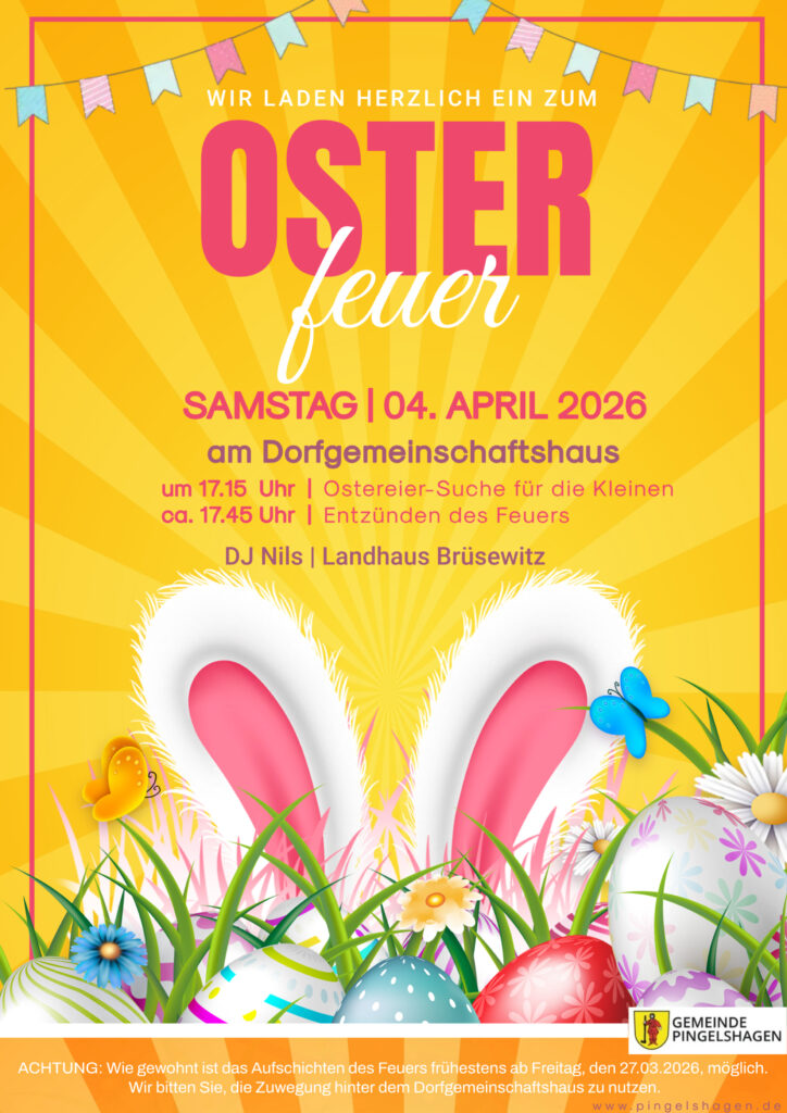 am 04. April 2026 findet zwischen 17:00 und 23:00 Uhr unser Osterfest mit dem traditionellen Osterfeuer statt. Um 17:15 Uhr beginnt die Veranstaltung mit dem Ostereier-Suchen für unsere Kinder. Gegen 17:45 Uhr entzünden die Kameraden der Feuerwehr das Osterfeuer. Das Landhaus Brüsewitz sorgt für unser leibliches Wohl und DJ Nils für die musikalische Unterhaltung.
